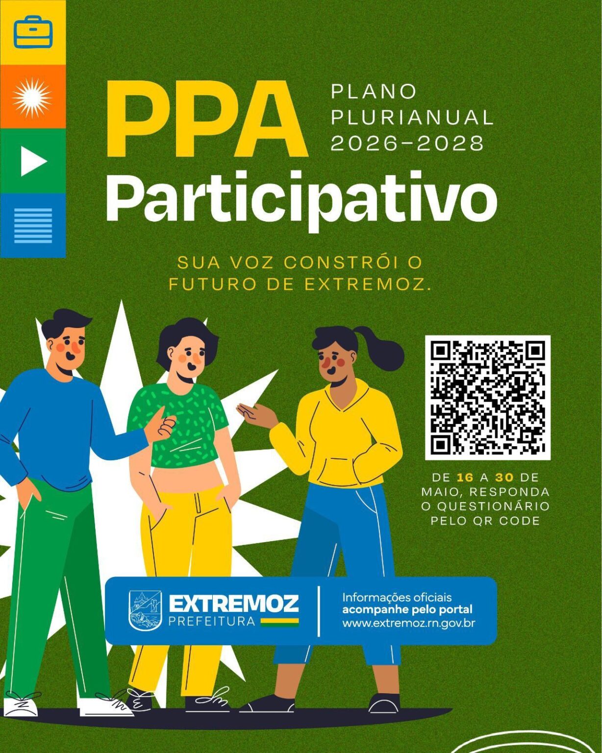 Leia maisA Prefeitura de Extremoz deu início ao processo de escuta popular para a construção do Plano Plurianual (PPA) 2026–2028 e da Lei de Diretrizes Orçamentárias (LDO) 2026. A participação é por meio eletrônico, de forma rápida e fácil. A ação reforça o compromisso da gestão com a inclusão cidadã e a transparência na definição das