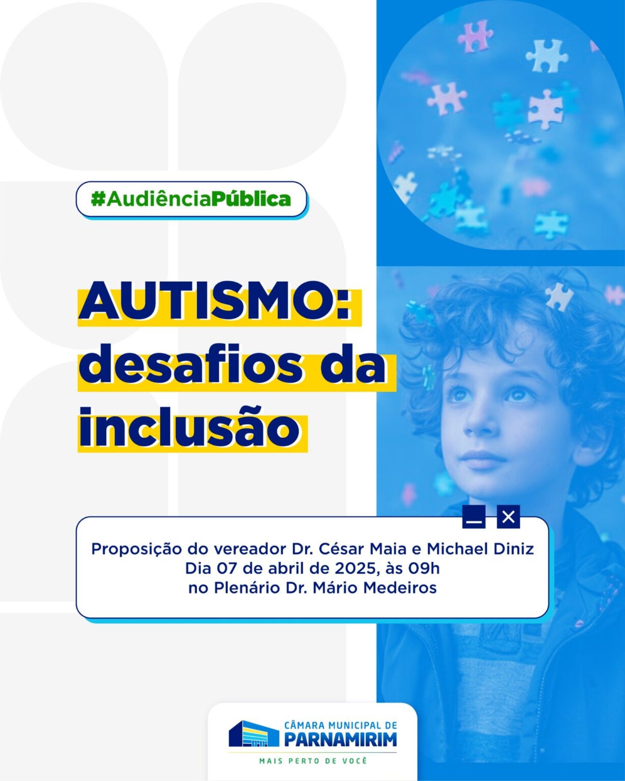 Leia maisPor iniciativa do presidente da Casa Legislativa, Dr. César Maia, e do vereador Michael Diniz, a Câmara Municipal de Parnamirim promoverá uma audiência pública para discutir os desafios da inclusão de pessoas com Transtorno do Espectro Autista (TEA) e fortalecer o diálogo entre a população e o poder público. O evento acontecerá na próxima segunda-feira, às