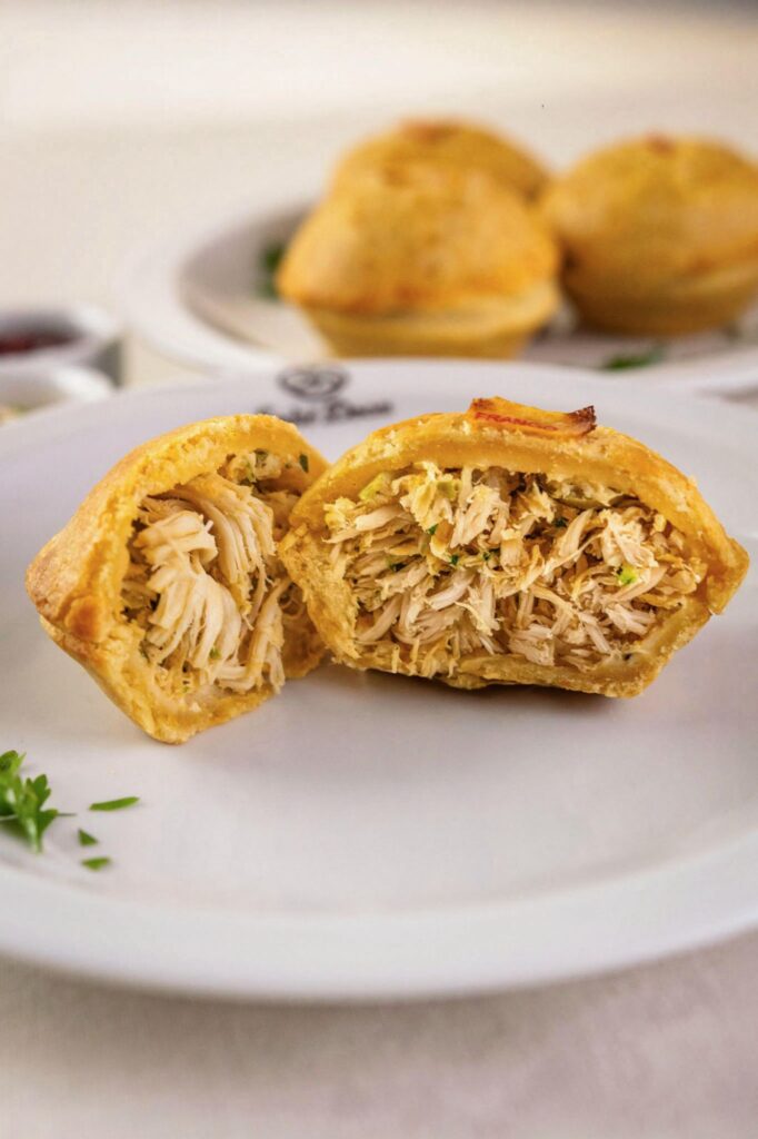 Na campanha Salgados do Mês, duas opções tradicionais ganham espaço: a mini coxinha de frango, com massa macia e recheio de frango desfiado bem temperado, ideal para lanches e pequenas celebrações, e a empada de frango, feita com massa amanteigada e recheio cremoso, reforçando o portfólio que vai além dos bolos.